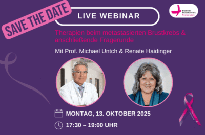 Save the date: Anlässlich des weltweiten Aktionstages für metastasierten Brustkrebs am 13. Oktober laden wir Sie herzlich zu unserem Webinar „Therapien beim metastasierten Brustkrebs“ ein. Informationen finden Sie im Beitrag.