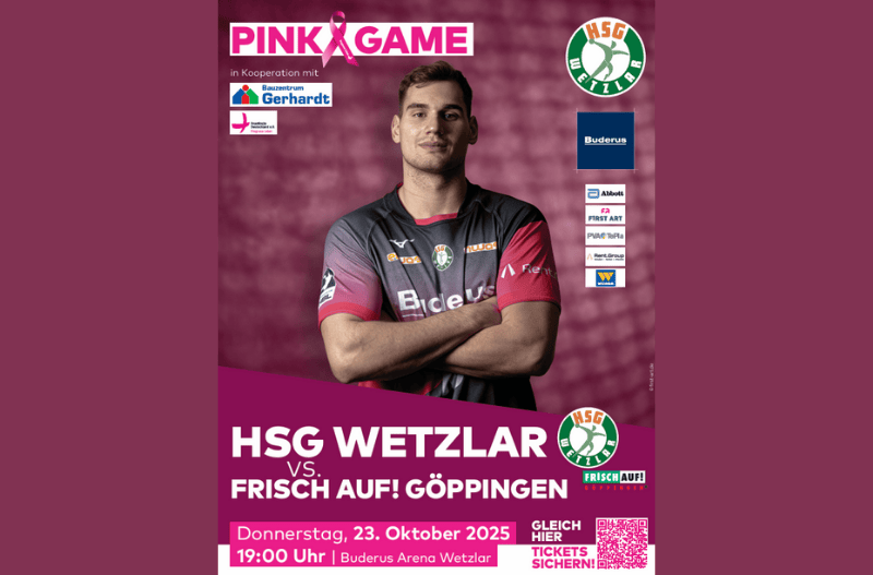 Am 23. Oktober 2025 um 19:00 Uhr findet das PINK GAME Heimspiel der HSG Wetzlar gegen Frisch Auf! Göppingen in der Buderus Arena Wetzlar statt. Die Spiel- und Warm-Up-Trikots werden anschließend für den guten Zweck versteigert.