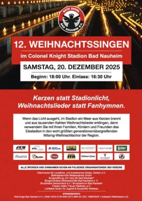 Am 20. Dezember 2025 um 18:00 Uhr wird es in Bad Nauheim im Colonel Knight Stadion wieder besinnlich, wenn Groß und Klein im Chor und im Kerzenschein zu singen beginnen.