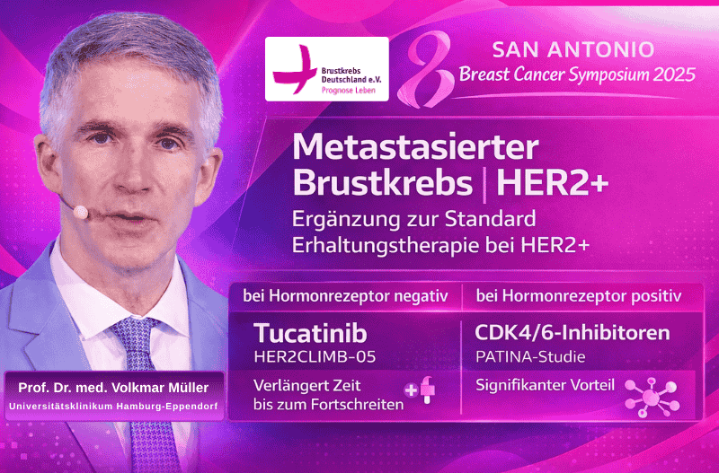 Prof. Volkmar Müller, Universitätsklinikum Hamburg-Eppendorf und Renate Haidinger für Brustkrebs Deutschland e.V.. Prof. Müller fasst im Video die aktuellen Entwicklungen bei den Erhaltungstherapien für den metastasierten, HER2-positiven Brustkrebs zusammen.