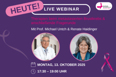 Anlässlich des weltweiten Aktionstages für metastasierten Brustkrebs am 13. Oktober laden wir Sie herzlich zu unserem Webinar „Therapien beim metastasierten Brustkrebs“ ein. Den Link und weitere Informationen und finden Sie im Beitrag.
